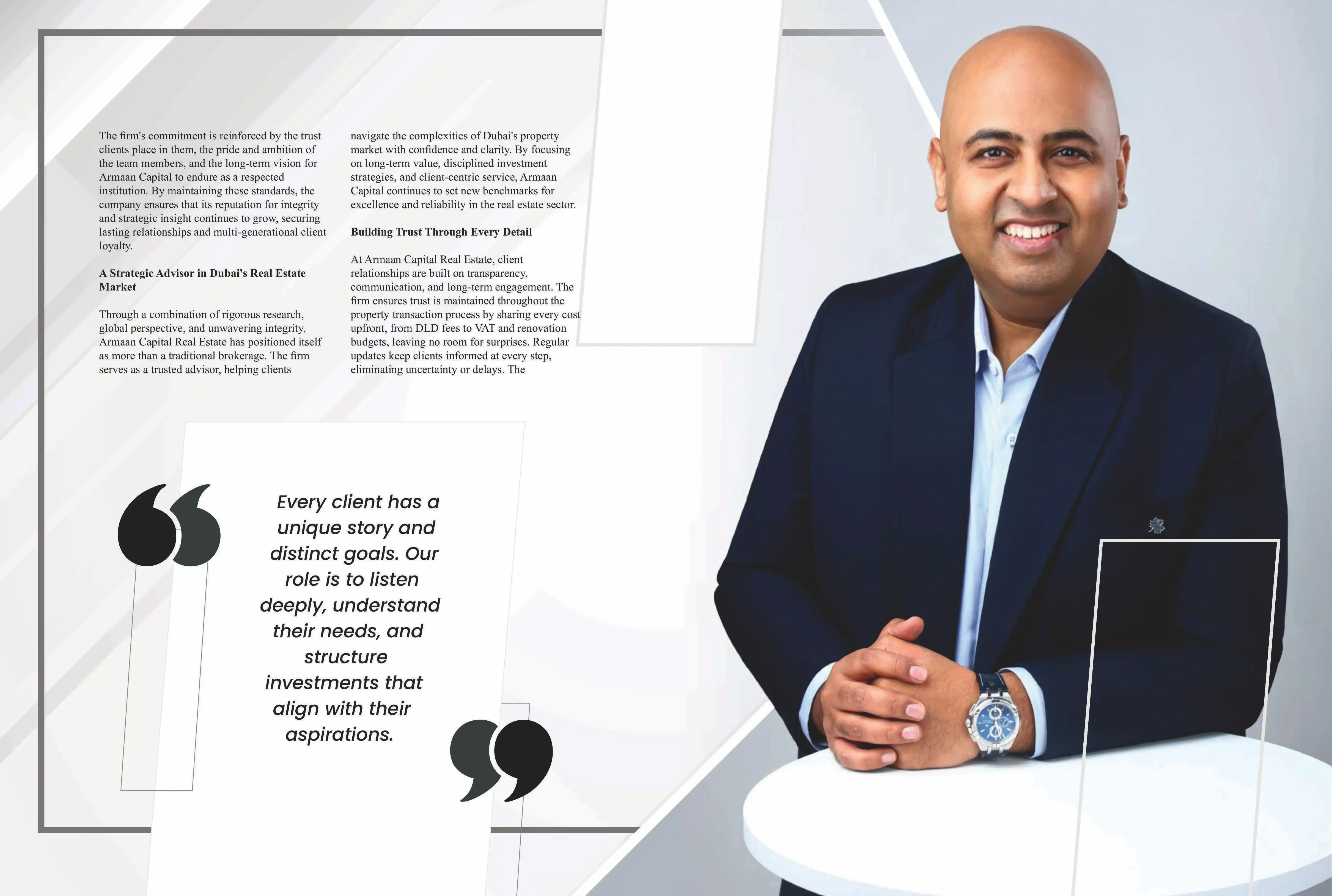 Armaan Capital tailors its services to meet the unique needs of each client. Recognizing that every client has a distinct story, ranging from first-time buyers seeking stability to high-net-worth individuals pursuing trophy assets, the firm emphasizes deep listening and understanding. The team assesses each client’s risk appetite, customizes investment structures including offshore companies, free zones, or mortgage solutions, and adapts communication styles and reporting to suit diverse backgrounds, whether family offices in Singapore or entrepreneurs in Dubai. For Armaan Capital, real estate is not just about properties; it is fundamentally about people and creating solutions that align with individual goals.