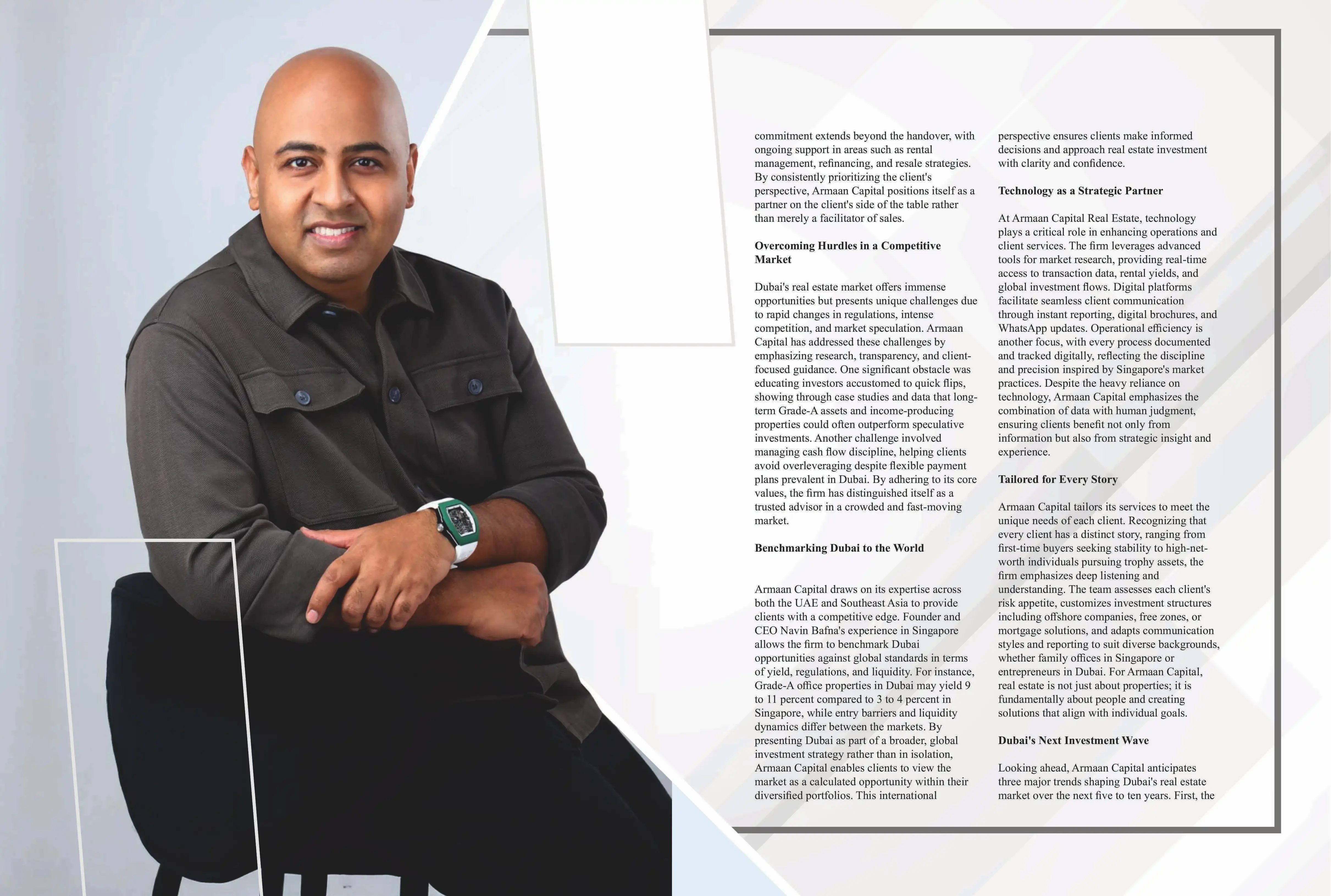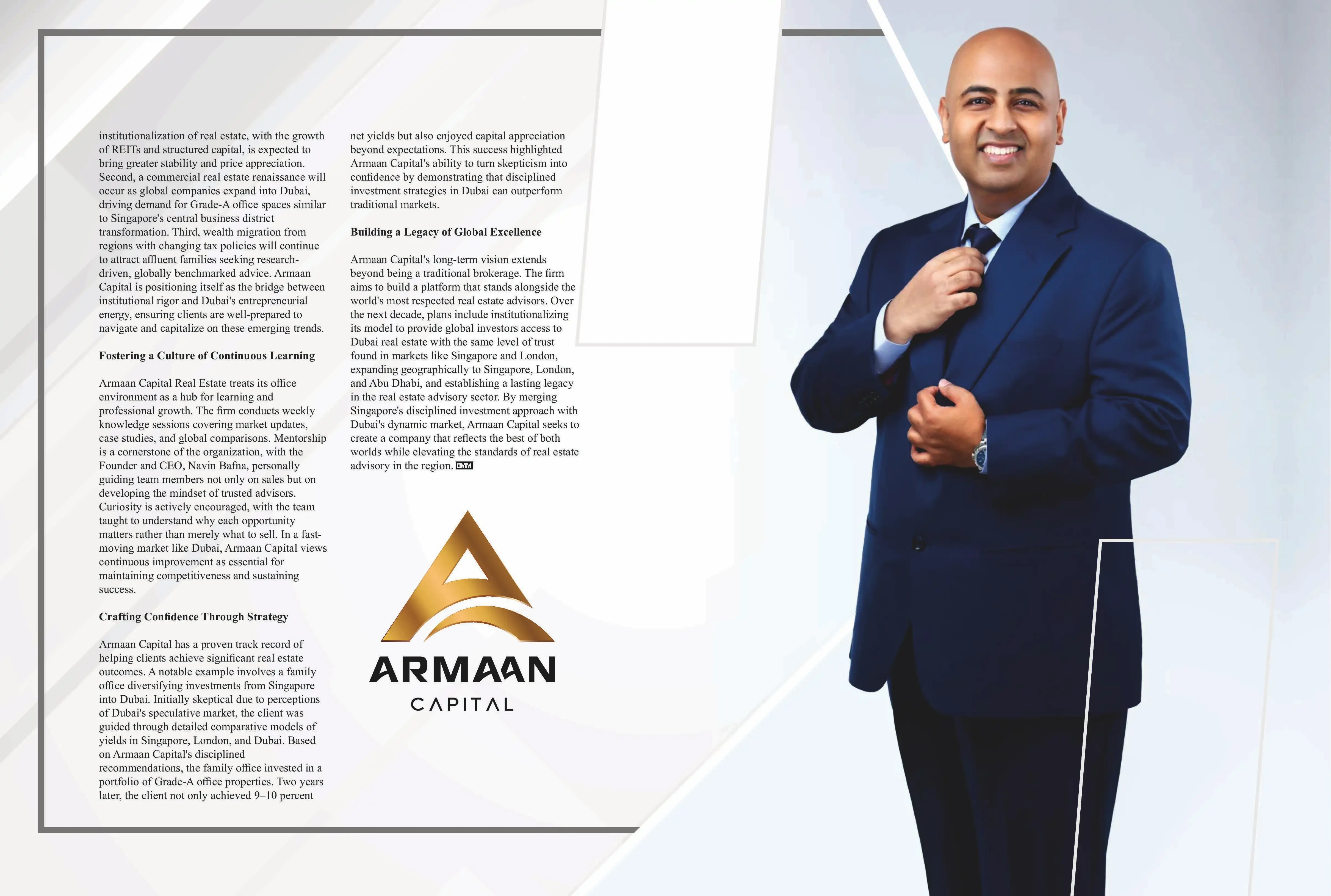Looking ahead, Armaan Capital anticipates three major trends shaping Dubai’s real estate market over the next five to ten years. First, the institutionalization of real estate, with the growth of REITs and structured capital, is expected to bring greater stability and price appreciation. Second, a commercial real estate renaissance will occur as global companies expand into Dubai, driving demand for Grade-A office spaces similar to Singapore’s central business district transformation. Third, wealth migration from regions with changing tax policies will continue to attract affluent families seeking research-driven, globally benchmarked advice. Armaan Capital is positioning itself as the bridge between institutional rigor and Dubai’s entrepreneurial energy, ensuring clients are well-prepared to navigate and capitalize on these emerging trends.