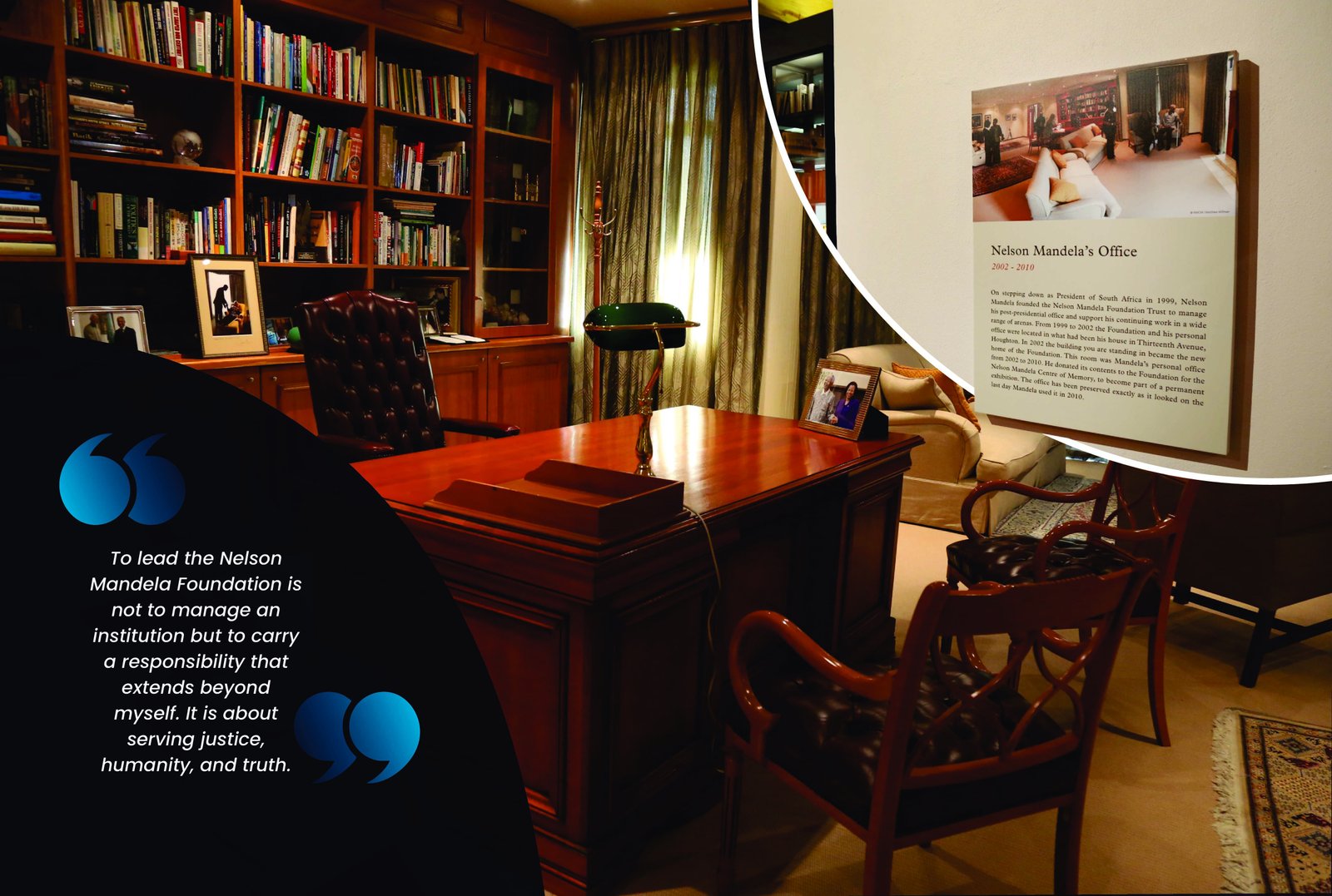 Mbongiseni sees the Nelson Mandela Centre of Memory as both a guardian of history and an active space for shaping the future. He explains that the Centre houses Madiba’s personal papers, his art collection, and the many gifts he received during his lifetime. These collections were entrusted to the Foundation by Madiba himself to be preserved in perpetuity. One of the most symbolic elements within the Centre is Mandela’s office, which has been maintained exactly as it was on his final working day in November 2010, offering visitors a direct connection to his presence.